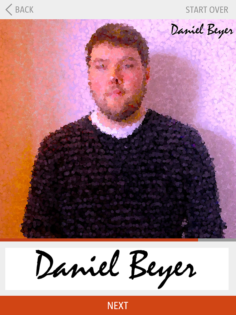 By interacting with the iPad’s interface, visitors could first take a “selfie”, then apply a pointillist filter, select the thickness of the dots (small, medium, large), apply color gradients (tint, temperature, and saturation), add a digital signature, and then email or share the finished self-portrait on Facebook.